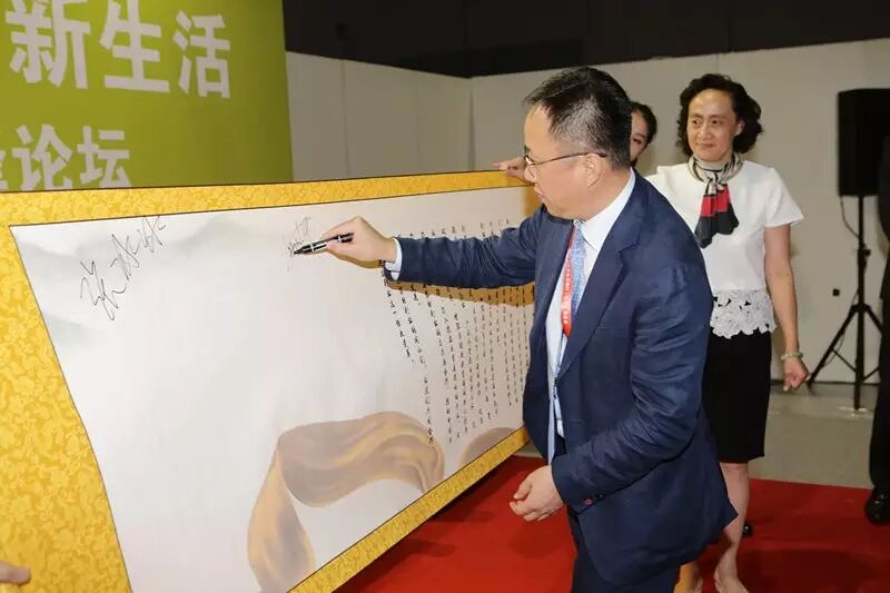 中国家用纺织品行业协会会长杨兆华在大家居战略联盟宣言上签名