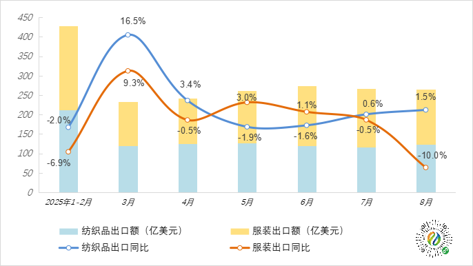 图1 2025年1~8月全国纺织品、服装出口月度统计