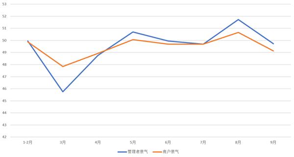景气方面,2022年1-9月,纺织服装专业市场管理者景气与商户景气走势基本一致。管理者景气平均指数为49.53,商户景气平均指数为49.48,均低于50荣枯线;1-9月专业市场运管理者与商户整体信心不足,景气指数偏低。